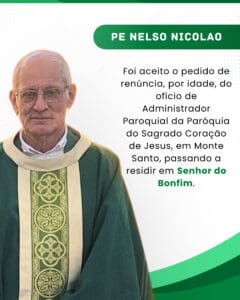 – Do Pe. Nelso Nicolao, foi aceito o pedido de renúncia, por idade, do ofício de Administrador Paroquial da Paróquia do Sagrado Coração de Jesus, em Monte Santo, passando a residir em Senhor do Bonfim;